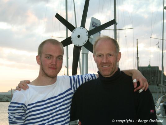 28 June / Børge and his son Max enjoyed a few hours in Bergen, before parting ways for now. Behind them can be seen the wind generator, which provides the power needed on board.