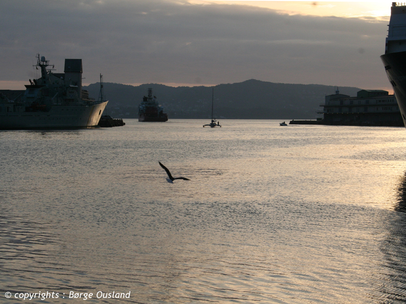 28 June / The unmistakable profile of the trimaran as it enters Bergen harbour.