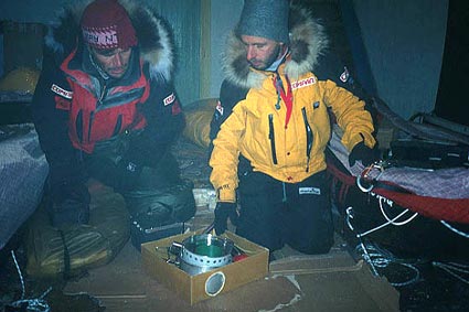 Thursday February 21, Tiksi / It was Dixie on the satellite phone today. He confirmed that the "fuel flight" had gone off well and that therefore everything was now ready to leave the next day, Friday, aboard a civil helicopter, for the Northwest of Kotel'nyy Island, approximately three hours flight away. They were testing their equipment one last time...